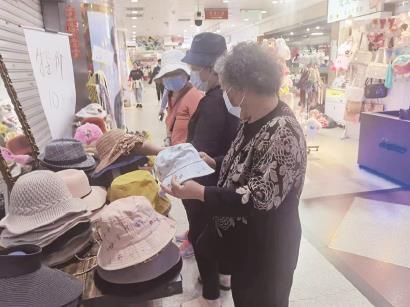一张简陋的桌子在走廊上摆开帽子眼镜摊,用纸牌写着“特价10元起”。老姐妹们停下脚步看起了帽子,这里的帽子种类很多,从夏季的遮阳帽到冬季的保暖帽都有。不过,也没什么很特别的。