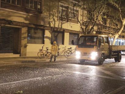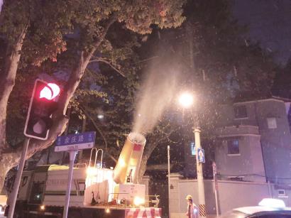 4月17日晚上9点左右,随着一阵机械设备的启动声,广元路上立刻下起了“毛毛雨”。只不过,雨量可比真的毛毛雨要大,只见悬铃木果毛刷刷地往下掉,在路灯下,黄色的果毛看得特别清楚,宛如“鹅毛大雪”。