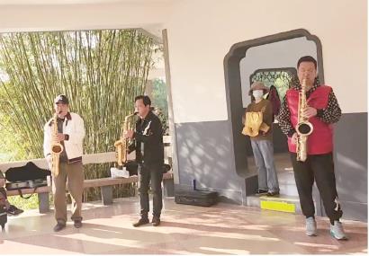 离公园深处的凉亭还有五米远,萨克斯独有的低沉“嗓音”已经牵着《月亮代表我的心》的旋律在记者耳旁摩挲。