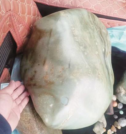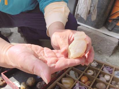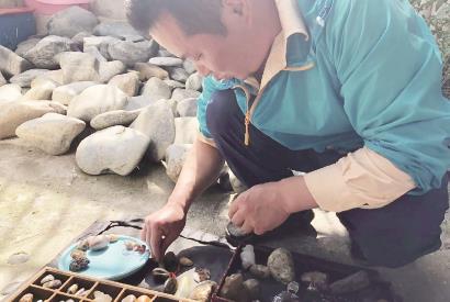 一走进倪晓明的家中,他就热情地向记者展示他收藏的大大小小、各种造型、各种材质的宝贝石头。只见院子里铺满了一块块大石头,每一块都很沉,轻的估计有五六斤,重的一二十斤。“这些都是籽料原石,从外表看似乎很普通,等我浇点水你再比较一下。”倪晓明说着,便端来一盆水,等水一浇上去,石头便立刻显出深浅不一的颜色来。他又拿出手电筒来照石头,给记者讲述石头里的各种道道,“这块石头是红石,这块切割开来可能有惊喜……”