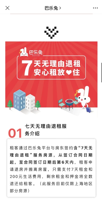 帮办记者调查发现,巴乐兔平台曾经推出过“七天无理由退租”服务,该服务介绍称,从签订合同日期起,至签订合同日期后第6天内,租客申请退房并搬离房屋,只需支付7天租金和200元生活费用,剩余租金和押金将全数退还给租客。