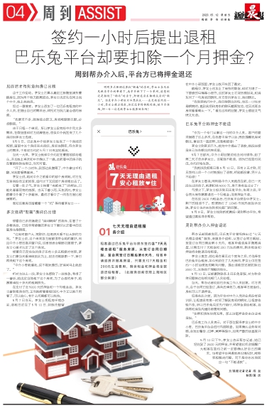 签约一小时后提出退租 巴乐兔平台却要扣除一个月押金?