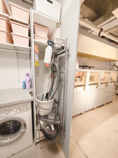 传统的定制柜或成品柜都是用的固定不动的搁板,当抛弃搁板,让里面能拉出来之后就出现了专为家政深柜收纳“量身打造”的多功能内置拉篮——