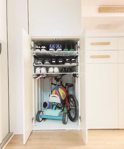 目前,因为柜子里还要放儿童车,就只装了3层拉篮,一个季节常用的鞋、运动用品等,出门要用的东西塞得满满当当,但拿取一点都不麻烦!