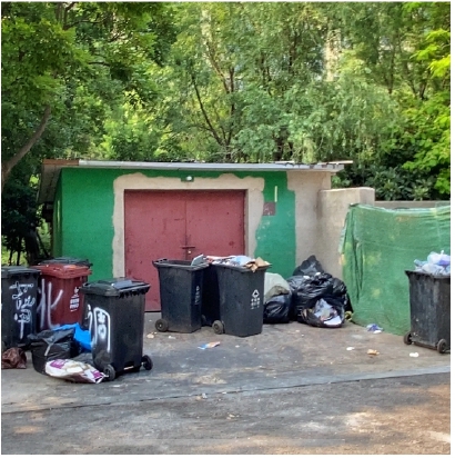 道路靠近河边的一侧安装了不少充电装,但是停在充电桩前的车辆并非都是新能源车。透过车辆的空隙,可见被随地丢弃的生活垃圾。垃圾房边的黑色垃圾桶也没有整齐摆放,显得比较杂乱。