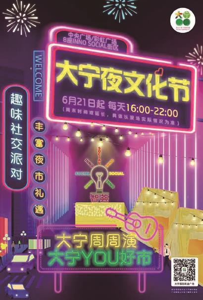 据悉,“大宁夜文化节”以8座INNO SOCIAL街区为中心,从网红人气美食、文创动漫周边到香氛萌宠,各类夜间消费新业态汇聚成了一条露天版的“街区夜市”。与此同时,精彩活动纷至沓来,唤醒夜间活力。6月21日开幕式当天,曾参与过“浓情静安爵士音乐节”的顶尖乐队将再登大宁国际,用音乐邀请全民嗨翻夏至夜;端午假期期间,更有不同音乐风格的音乐人唱响街区,呈现越夜越魅力的微醺派对;活动期间,大宁夜文化节将围绕“微醺纳凉”、“潮玩运动”、“萌宠生活”、“环球巡游”等精彩主题,持续打造多元化的夜间新玩法。此外,8座2楼INNO SOCIAL智荟中心还将惊喜呈现数场文化社群活动,即兴戏剧、交友派对、桌游、白领拉花等,迎合众多年轻人喜欢的新型社交玩法,帮助大家找到同频共振的灵魂。步入夜幕下的“大宁国际”,烟火气与文化味巧妙融合,魔都也在“夜生活”中释放出更新、更持久的城市魅力。