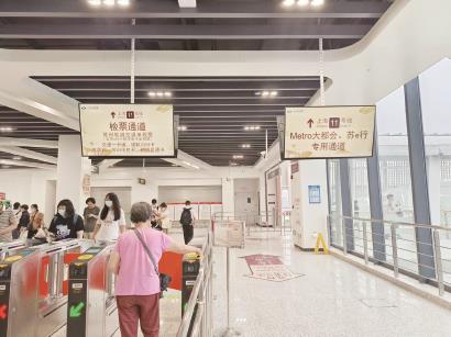 使用“苏e行”或“Metro大都会”App乘车码的乘客,从苏州/上海任一站点进站后,无需二次安检、刷卡及扫码,即可通过无感换乘通道换乘。当天,记者从上海轨交11号线站厅步行至苏州轨交11号线站台,共花了约4分钟。