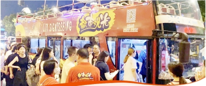 此外,为了保证排队秩序,维护专等上层景观位游客的利益,晚上运营时段,双层敞篷观光车兜一圈到站后,要求全部乘客都要下车,如果想要再次乘坐,就必须重新排队。