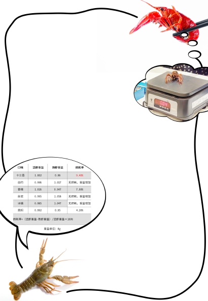 “因为这3种口味都需要经过油炸的程序,通过油炸,会让小龙虾的虾壳变薄,龙虾体内的一些物质会随着油炸流失,是导致损耗的原因,”向先生表示,即便如此,一般情况下,这3种口味的小龙虾都需要在汤汁里浸泡20分钟左右,保证入味,所以一般情况下,损耗率会比测试出的9.4%更低。