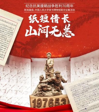 2023年是抗美援朝战争胜利70周年,志愿军英雄的一腔热血,铸就了70年来的山河无恙。值此之际,新闻晨报携手中国人民大学家书博物馆,共同发起抗美援朝家书征集活动,期待与大家一起重温写于70年前的家书,致敬参与过那场战争的志愿军英雄,纪念在那场战争中牺牲的志愿军烈士,弘扬伟大的抗美援朝精神。
