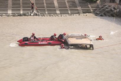 接报后,水域救援消防员抵达现场后兵分三路,一路用绳索通过桥面索降营救,另一路消防员从岸边出发,在做好保护措施后,向车辆游去。