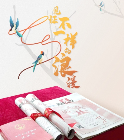 墙边书桌上,一张张复古婚书等待新人们书写落款。一旁的咨询台前,一份份《新闻晨报》官宣着新人们的结婚喜事。