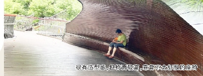在水城路、长宁路的苏州河景观步廊,有一款造型独特,靠背是曲线形的座椅,很吸引眼球。但是,在此休息的郭阿姨说,这种座椅造型虽新颖,但靠着很不舒服,座椅高度也有点高,所以她更喜欢盘腿坐在上面。