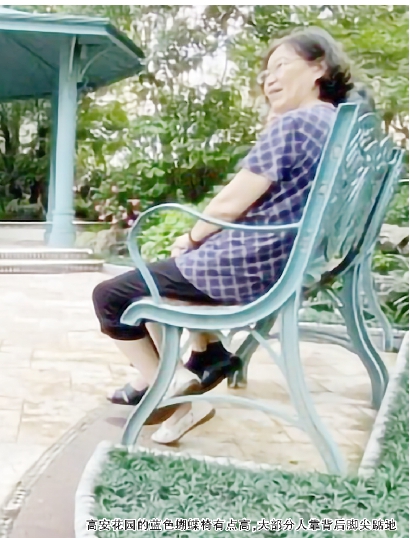 次高的是高安花园里的5把蓝色蝴蝶座椅,高度均为53厘米左右。一名五六十岁,身高约160左右的女士正坐在其中一把椅子上休息,“这把椅子如果能低五六厘米,就舒服了。我现在整个屁股坐在上面,要脚尖踮地,时间长了,不是很舒服。”记者是小个子,坐上去试了一下,如果双脚全部着地,只能坐1/3椅面,如果屁股全部坐上去,双脚就离地了。