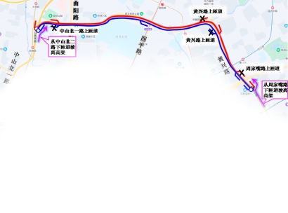 周五至周日23时至次日6时主线封闭,车辆需从中山北二路下匝道驶离高架主线,前方中山北一路上匝道、黄兴路上匝道关闭。
