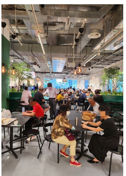 到了中午十二点,商场内的热闹逐渐涌向二楼餐厅。在一众年轻人中间,散落着偶尔四处打量的老年人。