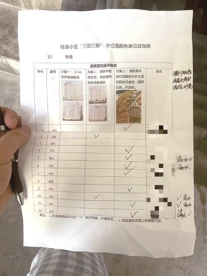 “很多居民得知此前的投票竟然不作数,又通过12345投诉,再次要求公示方案。投诉后,施工方在小区里装了一块印着效果图的牌子,上面的图片就是‘方案二’。”袁女士说,居委会新下发的《居民意见征询表》也让大家摸不着头脑,“首先他们没有在整个小区征询,而是在搭好脚手架的楼栋逐栋征询,其次意见表上已经没了方案三,只剩方案二,征询内容是询问小区居民是否同意该方案。”