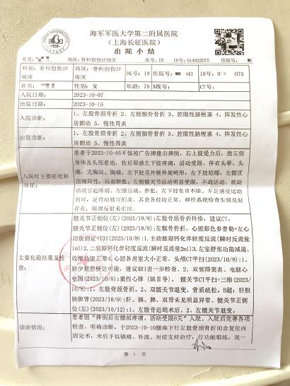 经医院诊断,陆女士胯部和左膝盖骨折,而且左膝盖系粉碎性骨折。医院告知,陆女士可能要换人工关节。经过一番考虑之后,10月7日,陆女士被转到长征医院继续治疗。10月15日,陆女士从长征医院出院后,又被转往一家康复医院做康复治疗。