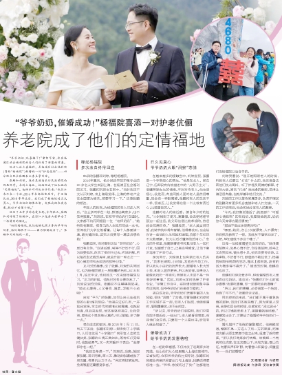 张鹏和刘琼,原本是湖南长沙民政学院的同届同学。来到上海后,杨福院成了他和她的“定情福地”。他俩乐呵呵地告诉记者:“我们本来不在一个班。2016年来杨福院见习,才互相认识。2018年毕业后,我们成了杨福院的正式员工。爷爷奶奶们都很机智,发现我俩在谈恋爱,就时不时催个婚。”