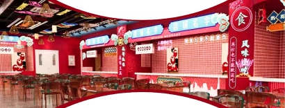 从效果预览动画可见,即将与市民游客见面的沪大笙美食街以红色系装潢为主,开阔的大理石地面上,一个个餐饮档口围边而设,中间则是公共区域的就餐桌椅。复古的霓虹灯箱及老上海广告牌装修在朱红墙面之上,顶部亦有国潮彩灯与许多上海元素。