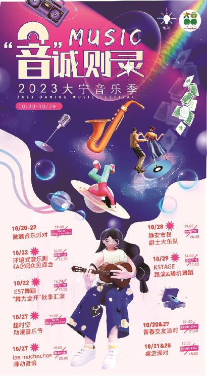 在20℃的清凉秋风中,感受100℃的音乐盛宴。在沉浸式音乐剧《A·I》观众见面会现场,主创团队分享了一个关于“爱”和“A I”的故事。同时还公开演唱多首ost曲目;此次音乐季还特别联动E57舞蹈工作室开启“舞力全开”秋季汇演,邀请各位萌宝们尽情展示天赋才艺。还邀请了las m uchachuas乐队带来一场躁动音浪,用live的形式献上音乐盛宴;另外,K-stage随机舞蹈快闪carry全场,百人舞蹈快闪炸翻全场;值得一提的是,国内首支市民爵士大乐队也亲临现场创新呈现爵士乐与中国传统文化的完美融合。大宁音乐季的舞台致力于为人人提供梦想舞台,让人人皆可享受不同音乐跨界融合的魅力。2023大宁音乐季邀请你来嗨。愿你在音乐的热浪中,遇见更多志同道合的朋友,收获超多无尽的欢乐。