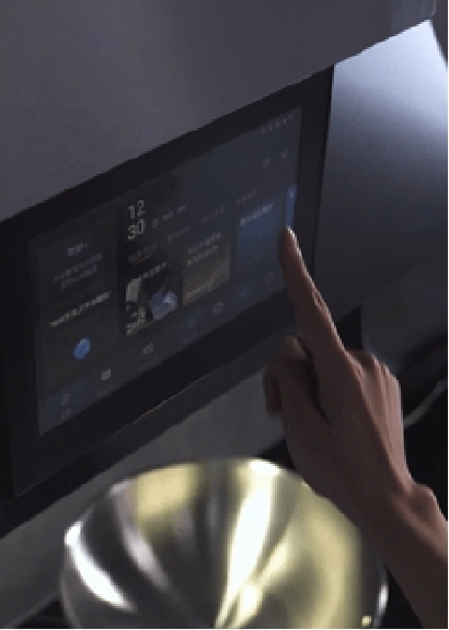 当工作人员挥手打开了一台油烟机,记者发现打开后油烟机慢慢启动,是默认的自动风力,如果需要切换成强劲吸力,可以通过触控屏幕控制,工作一会儿后再挥手,就能关闭。