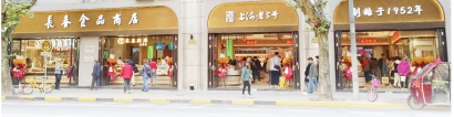 焕新升级后的长春食品商店,外观上以石库门和古铜色为主基调,门头上有“上海老字号”和“创始于1952年”字样。从一旁路过时,就可以看到这家老字号的招牌之一——芝麻核桃粉。