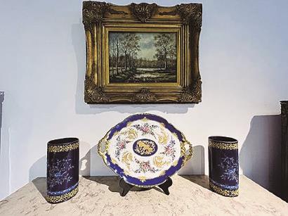 在长阳创谷的G2引力艺术空间的展览现场,19世纪手绘拿破仑征战双仕女耳豇豆红镀金瓶、手雕大理石双鹰鎏金铜石瓶摆件、埃及人物图案双耳罗马风格镀金瓷瓶以及拿破仑和将军白瓷镀金座钟、领袖台灯、大鎏金手绘双天鹅瓷瓶、1804年拿破仑登基大典纪念瓷盘、拿破仑家族使用过的书房家具等等为观众系统呈现了欧洲文化与文明发展对世界的影响。