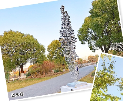 最给人以启示和震撼的是一座取名为《通天塔》的铸铁雕塑。这个高度有4.1米的作品,由无数根钢条组成,构建成一座座多层小屋的造型。整体呈中间粗,两端尖的形状。仰视,巍峨如擎天铁塔;近观,威严似巨兽金刚。我不由自主地思索,那一扇扇临空的门窗,那一层层垒起的梁柱,既可揭示人性本来善良的初衷,又可唤醒人类追求幸福的坚韧。在这空洞而又坚固的擎天立柱面前,情感终会交融,性格必将显露,内心一定敞开,向往势必成功。正如解说词中所描绘的那样,这件作品象征着人类对探索和追求进步的不懈追求。游人在它面前走过,都会情不自禁地向它注视,致以敬礼。而我则钟情于它的精致和深沉而久久地站立在其身边,想像着生命的坚强与追求的无垠。