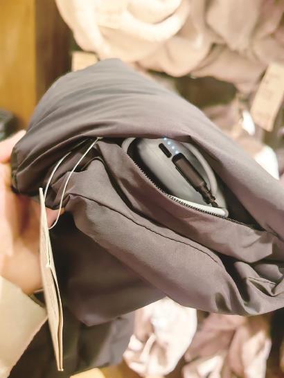 记者看到,在山姆的“户外”衣物展示区域,挂着多款颜色的男士马甲,这些男士马甲外观上看造型和普通羽绒马甲相似,仔细观察则能看到右口袋上有一个圆形按钮。而当人们把手伸进右口袋里,则能掏出一个带有USB接头的线。