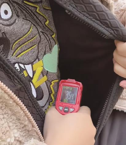 而用温度计测量后发现,在户外,电热马甲发热块的温度能达到30℃-40℃,其他区域就和普通的衣服一样,在20℃左右。