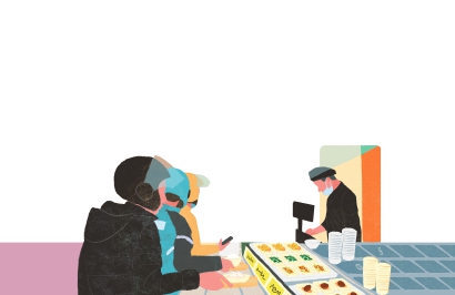 “比较节省时间的话,就吃包子啊。那样快一点,因为我们中午单比较多。偶尔中午太忙了,忙过头了,到下午2、3点。时间比较充裕的话,去吃点稍微好一点的。”