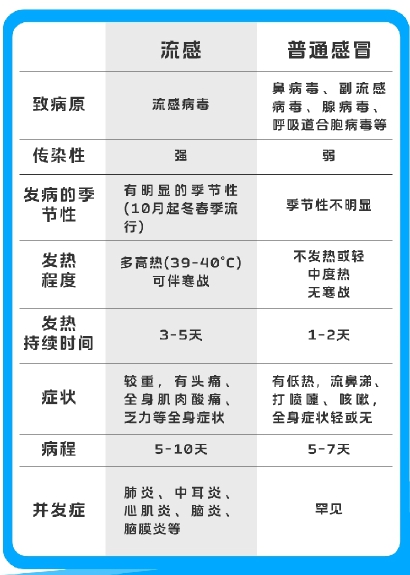 上海市胸科医院呼吸与危重症医学科张海医生指出,季节性流感病毒分为甲、乙、丙、丁四型。目前已知只有甲型流感病毒会引起流感大流行,乙型流感病毒可引起季节性流行和暴发。除了打喷嚏、鼻塞、流鼻涕、咳嗽为主的感冒样症状,流感的全身症状比较严重,表现为:1、高烧明显(39℃-40℃),短时间内的体温快速上升;2、疼痛明显(头痛、咽痛、肌肉酸痛);3、疲劳乏力明显;4、剧烈咳嗽明显。