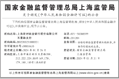 国家金融监督管理总局上海监管局 关于颁发《中华人民共和国金融许可证》的公告