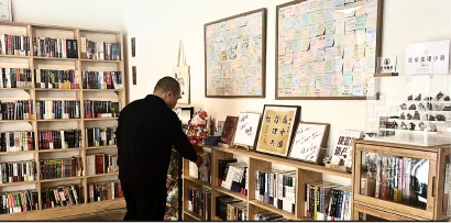 本土推理小说家陆秋槎尤其支持时晨的想法。书架上的镜框里,装着他写给谜芸馆的书法:“为中国推理共勉!”