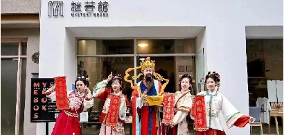 2月18日,年后首个工作日,五角场创智天地请来财神与诸仙女,在伟德路的谜芸馆门前拉开“恭喜发财”的字幅,为这家只有59平方米的书店打call。