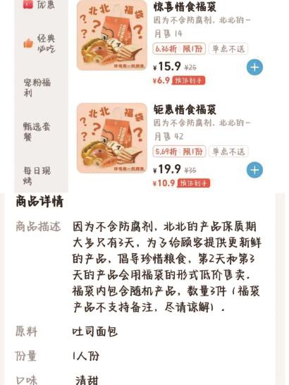 在商品描述中,商家写着:本店面包的保质期大多只有三天,为了给顾客提供更新鲜的产品,倡导珍惜粮食,第2天和第3天的产品会用福袋的形式低价售卖。福袋内包含随机产品,数量三件,不支持备注,敬请谅解。