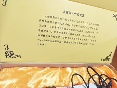 刚打开包装盒,一段名为“太赫兹生命之光”的简介就映入眼帘:“太赫兹是介于红外线与微波之间的波段,它与人体细胞是同频共振,每秒钟上亿次振动,太赫兹光波理疗仪具有穿透性、识别性,可以激活人体惰性细胞和休眠细胞,打通微循环,促进血液循环,排毒排湿提高人体基础体温……它被科学家称为改变世界的十大科技之一……”