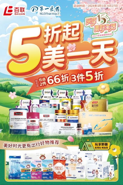 此外,围绕“暖春焕新·15LIFE生活节”主题,第一医药促消费举措频出,首批有超500个爆款商品参加惠民活动,上百款健康商品低至5折。3月1日-4月27日期间,第一医药为“暖春出行季”准备了惊喜活动,出行好物及健康护理产品限定折扣,指定商品更有任意2件75折、任意3件5折的优惠。
