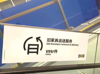 在宜家商场,记者看到在电梯等醒目位置,床垫、沙发、橱柜、餐桌椅等销售区域旁都标注出“旧家具运送一口价”等服务。