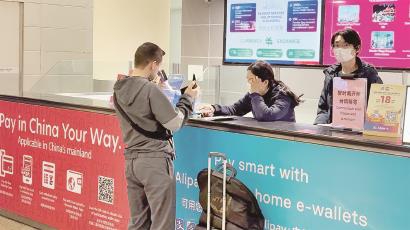 转机时间还很充裕,马克西姆左右张望了一番,立刻注意到紧邻国际、港澳台到达出口的A lipay+移动支付服务台。他上前找到一名工作人员询问起这项服务,大约一个小时后,带着满意的笑容离开了柜台。