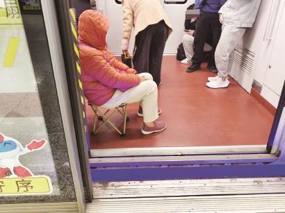 但地铁“板凳族”高峰常常和早晚高峰重合,地铁车厢内拥挤、没有座位的时候最易出现自带小板凳的情况。