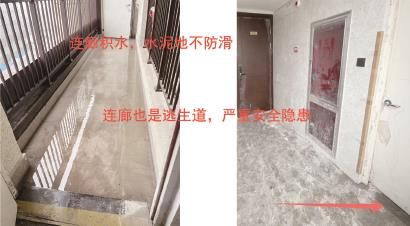 陈华还发现,楼梯间休息平台高低不平,呈毛坯状态。消防连廊地漏坡度不准,积水引发电梯厅、楼梯间渗漏,等等。