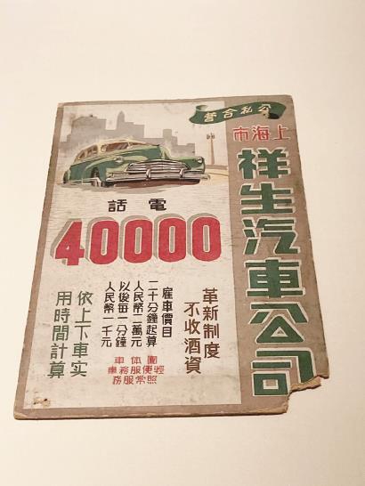 我们看到,一份有点残缺的祥生汽车公司广告牌上,醒目地印着叫车电话“40000”。本次展览策展人、上海市历史博物馆副研究馆员刘华告诉记者,当时祥生汽车公司广告的意思是“4万万中国人,拨4万号电话,坐中国车。”广告牌显示出近代中国人民族意识的觉醒,这一广告对祥生公司在上海与外商公司分庭抗礼,甚至超过外商公司起了很大作用。