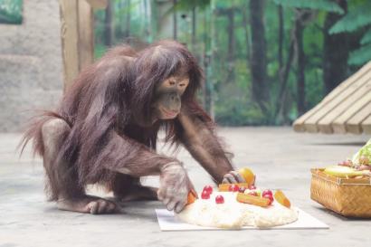 27日,首只在上海野生动物园出生的红猩猩“葡萄”迎来了5周岁生日。