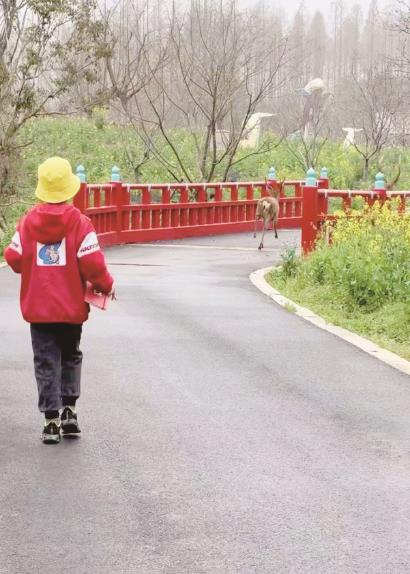 阳春三月的东平国家森林公园花团锦簇,有红色、橙色的玫瑰花,有黄色、粉色的郁金香,还有蓝色的二月兰。我们走在开满鲜花的小路上,不知不觉来到了樱花林。突然,我看到了几只小鹿出现在油菜花丛中。它们棕色的皮毛上有白色斑点,尖尖的耳朵竖起来,像一个个警惕的哨兵。它们头上还有两个树枝一样的鹿角,非常漂亮。其中一只鹿发现了我,我们四目相对,然后它和伙伴们迈开轻快的步伐迅速地跑进了丛林深处,消失在我们的视野中。