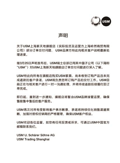 继3月25日声明发布后,USM瑞士总部已同其中国子公司(以下简称“USM”)对USM上海新天地旗舰店订单交付问题进行深入了解。