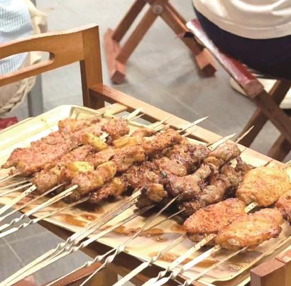在店里,雨琪看到了淄博烧烤通用的碳烤炉。店家把肉腌制好,串起来,烤到半熟,交给顾客自己掌握火候,和淄博当地通行做法一致。“你能看到肉从半熟的状态变成全熟,上面滋滋冒着油。口味和体验都有了。”至于淄博烧烤的“灵魂搭配”卷饼和小葱,那也是必备的。