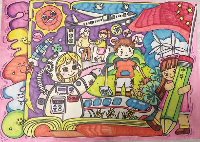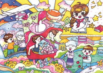评委点评:满满的画面里可以看到和谐的块面划分,学习与生活、高科技与新风尚交织呈现,纷而不繁。人物表情饱满,拟人化的数字和太阳等平添氛围。
