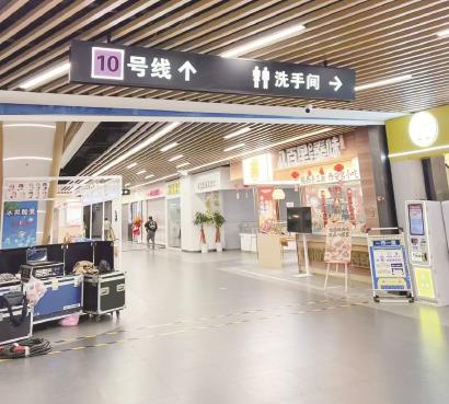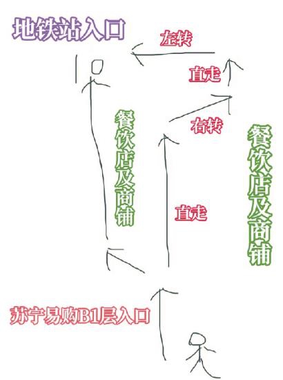 而另一条路线则是沿着苏宁易购商场的指示前进,在记者向前走了50米后,又出现了第二块指示牌,该标识提示行人往右前方走,经过几家餐饮店后,第三块指示牌出现,提示大家向左走,步行40米左右即可进站,总共花费近2分钟的时间。
